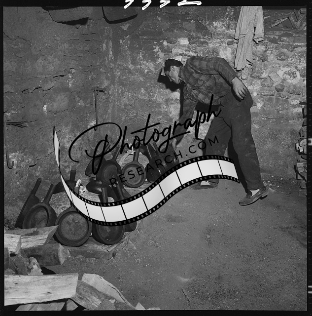 Summary: Photograph shows workers holding disks with tongs in front of a press at the cymbal workshop of Zilciyan (Zildjiyan, Zildjian), outside the walls of Istanbul, Turkey.