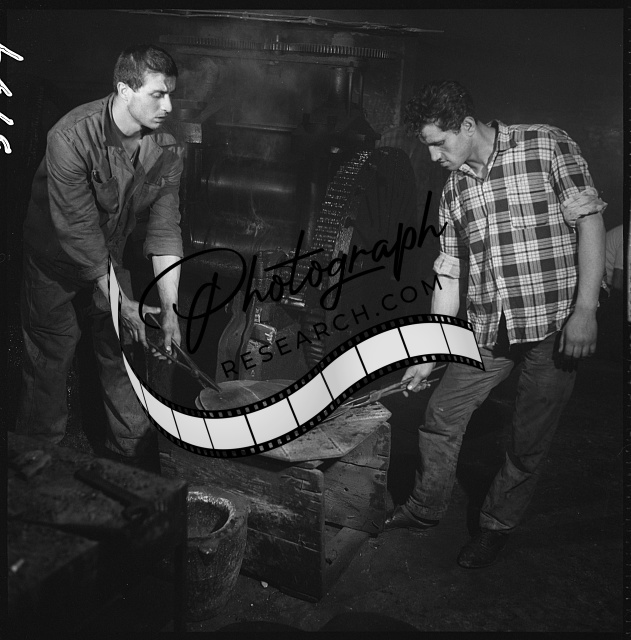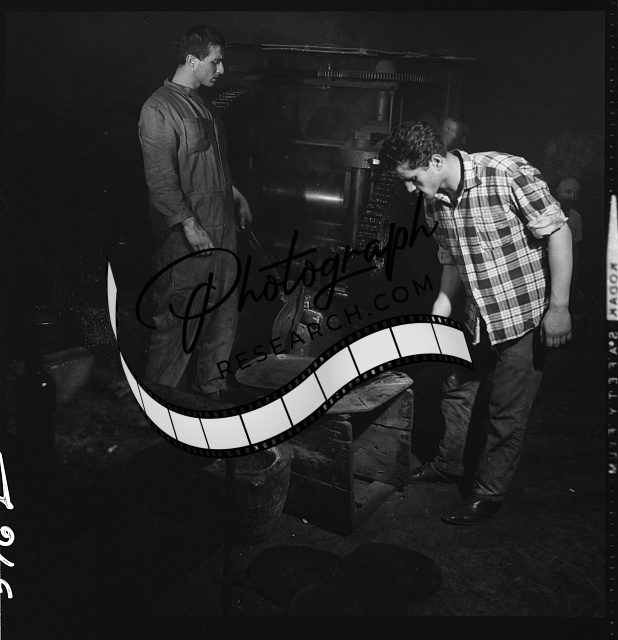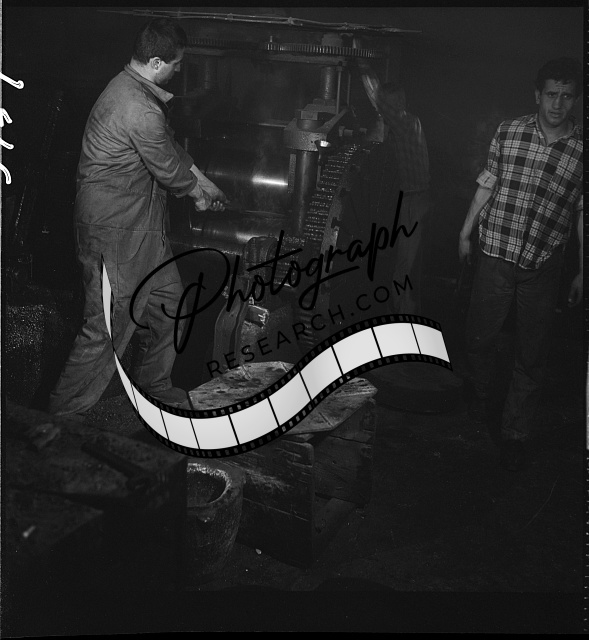 Summary: Photograph shows workers holding disks with tongs in front of a press at the cymbal workshop of Zilciyan (Zildjiyan, Zildjian), outside the walls of Istanbul, Turkey.