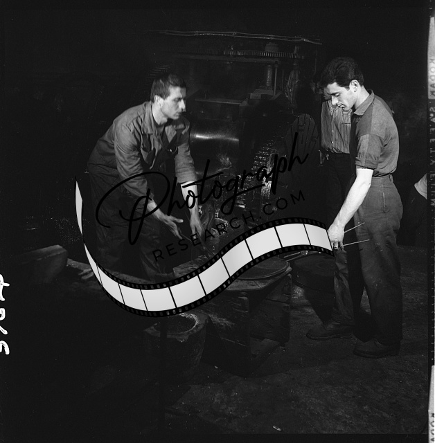 Summary: Photograph shows workers with molds at the foundry of the cymbal workshop of Zilciyan (Zildjiyan, Zildjian), outside the walls of Istanbul, Turkey.