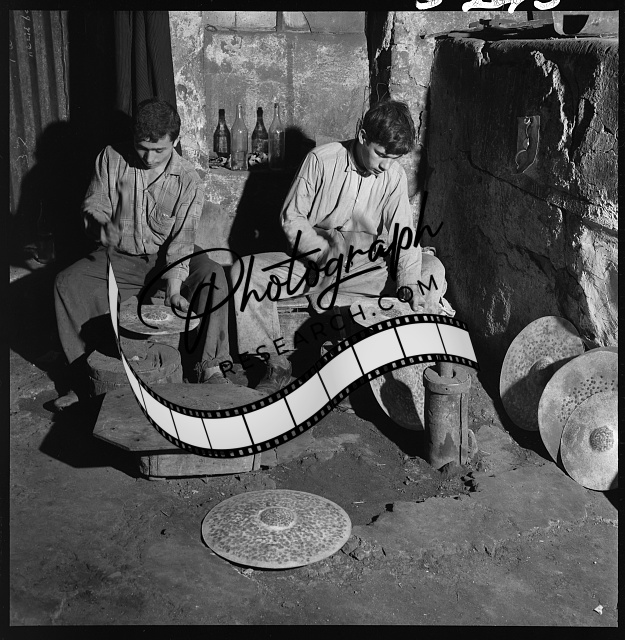 Summary: Photograph shows workers hand-hammering cymbals at the workshop of Zilciyan (Zildjiyan, Zildjian), outside the walls of Istanbul, Turkey.