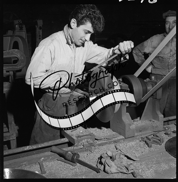 Summary: Photograph shows workers pouring metal into molds at the cymbal workshop of Zilciyan (Zildjiyan, Zildjian), outside the walls of Istanbul, Turkey.
