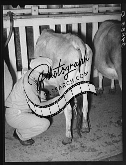 Title: Stripping a cow after she has been milked with electric milker. Dairy, Tom Green County, Texas