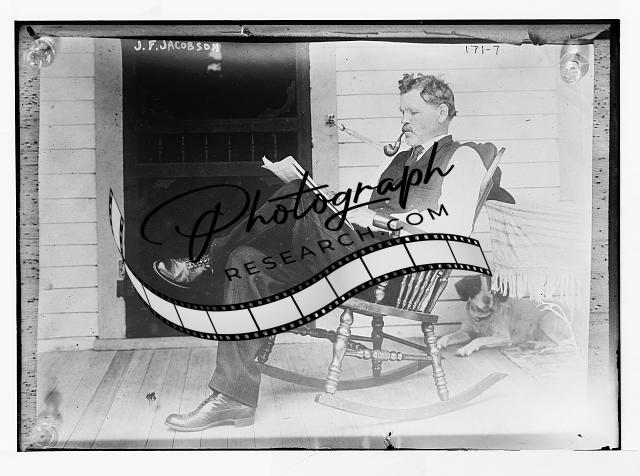 J.F. Jacobson,reading,in rocker,with dog,rocking chair