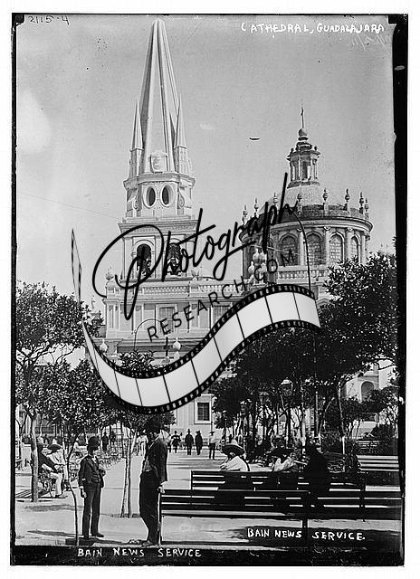 Cathedral,Guadalajara,Mexico,people,benches,Bain News Service,trees