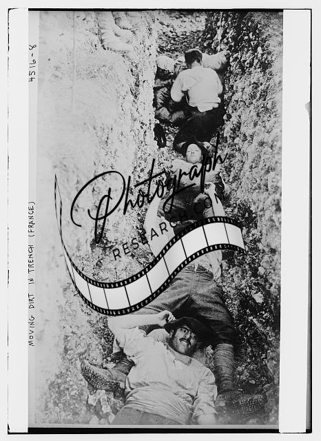 Moving dirt in trench,France,men laying in trench,Bain News Service