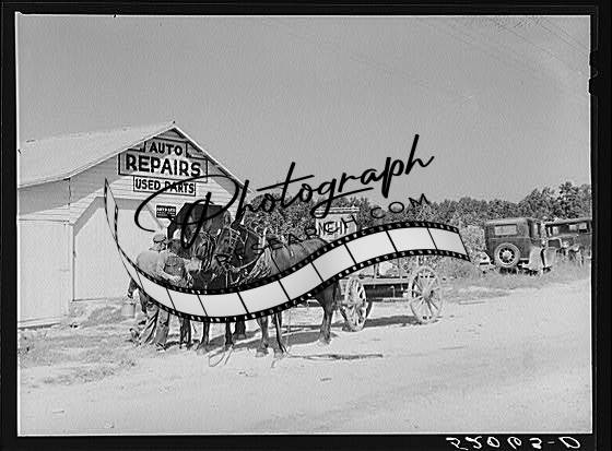 Title: Combination filling station, garage, blacksmith shop, grocery store. Frank Petty, owner of the wagon, has just had his mule shod, his corn ground, purchases some kerosene and is returning home. R.F.D. Danville, Virginia, Pittsylvania County