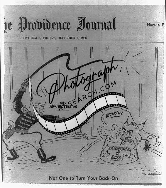 Political cartoon - "not one to turn your back on" - shows Eisenhower as lion tamer holding Senator Joseph McCarthy at bay