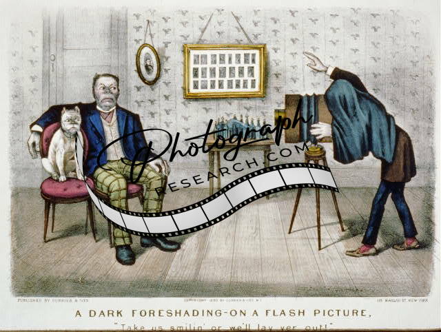 A dark foreshading,on a flash picture,'Take us smilin' !',Camera,c1890