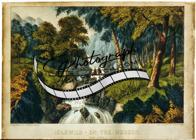 Idlewild,on the Hudson,the glen,couple on bridge,River,1856-1907,Currier & Ives
