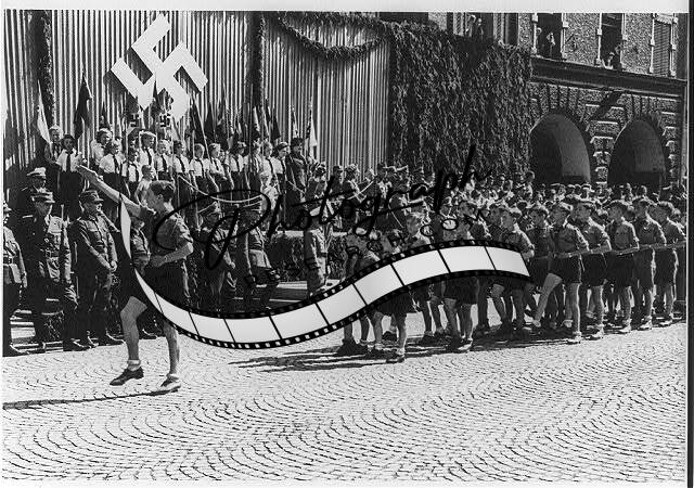 Kreistag in Rosenheim, Germany, 1942, 2 columns of Hitler youth passing in review before swastika'd platform.