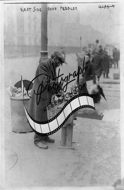 East Side food peddler,selling pretzels on sidewalk,New York City,NYC,1917