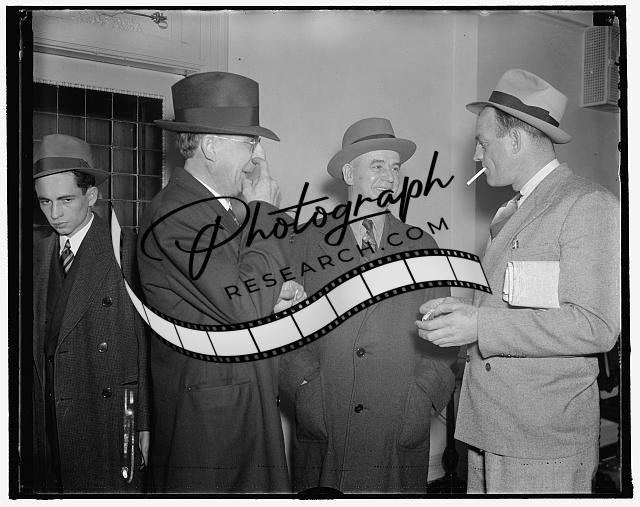 Title: C.I.O. leaders. Washington, D.C., Oct. 27. David Dubinsky, (left) President of the Ladies Garment Workers Union and Homer Martin, President of the United Automobile Workers, snapped as they chatted following the recess of the peace meeting between the CIO and AF of L. The labor factions will not resume their negotiations until November 4. 10/27/37