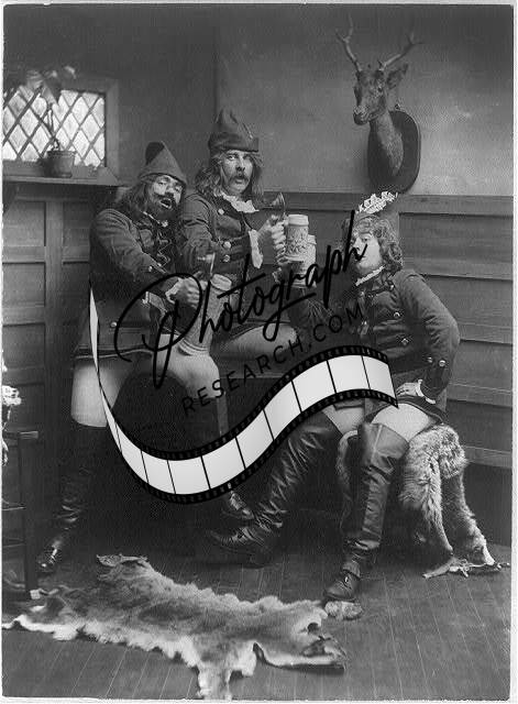 Three men in German student uniforms lifting beer steins,c1904,Advertisement