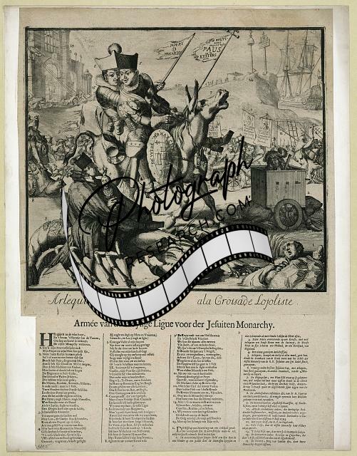 Summary: Print shows Louis XIV, with peg leg, riding a bear, leading the flight of catholicism from England; he moves to draw his sword to strike a lion, as a cock on his head is attacked by an eagle. Father Petre follows riding a large dog harnessed to a wagon carrying the royal family, James II, the queen, and James Francis, their infant son, known as the Pretender, holding a windmill. The dog defecates on the crown. A black imp with bellows harasses Father Petre. 'Pantagion' with sword drawn and bomb shooting hat brings up the rear riding a wolf. In the middle distance is a long line of priests and monks fleeing London. In the upper right corner, Pope Innocent XI wheels in a bishop.
