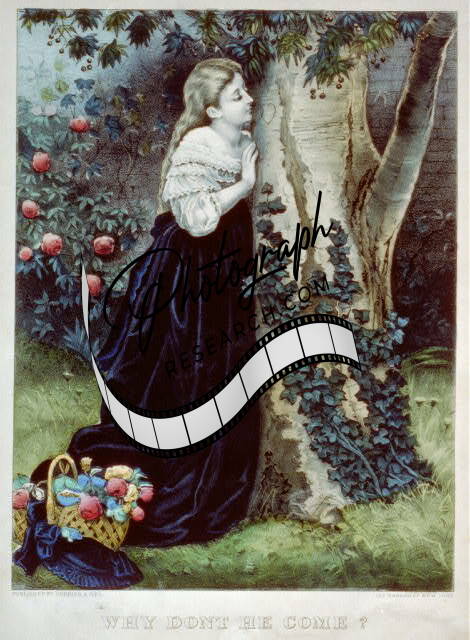 Why dont he come?,Currier & Ives Photo,1856-1907,woman,tree,flowers,basket