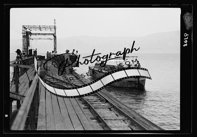 Title: Dead Sea Album, prepared for the Palestine Potash Ltd. Loading potash into barge from the Usdum pier. Jebel Usdum seen in background