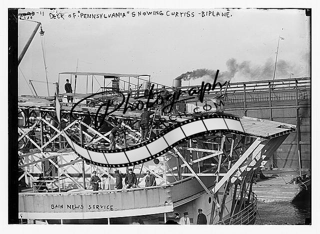 Deck of 'PENNSYLVANIA' showing Gelnn Hammond Curtiss biplane,people,airplane