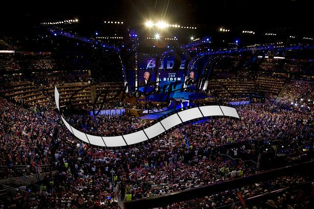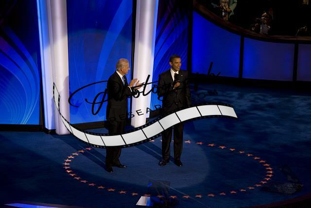 Title: Vice-Presidential candidate Joe Biden and Presidential candidate Barack Obama speak to the audience at the Democratic National Convention, Denver, Colorado, August 25-28, 2008
