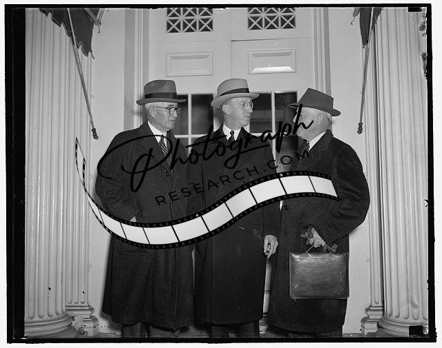 Title: Ickes denies wire tapping by his investigators. Washington, D.C., Jan. 11. Secretary of the Interior Ickes denied before the Senate Public Lands Committee that this department investigators had tapped telephone wires of any Senator or Representative. Ickes, testifying on behalf of Ebert K. Burlew, nominee for Asst. Sec. of the Interior, was questioned by Sen. Key Pittman of Nevada in regard to 'rumors' of a secret investigation of an unidentified Congressman. 'It is not true, and it has never been true as far as I know' Ickes said. Shown after the battle are, left to right: Sen. Alva Adams, Colo., Chairman of the Committee; Secretary Ickes; Burley; and Senator Key Pittman, 1/11/38