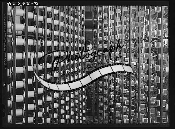 Title: Tying together the thousands of separate strands for a loom in the Denomah Mills, Taftville, Connecticut. Makers of rayon and cotton cloth