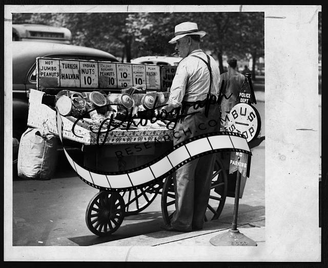 Man selling nuts from his pushcart,New York City,NYC,NY,1947,Bus Stop,vendor