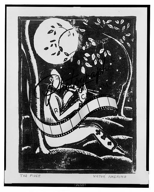 The piper, Print showing a seated young man or boy playing a double pipe in the moonlight. , Amerino, Victor, artist