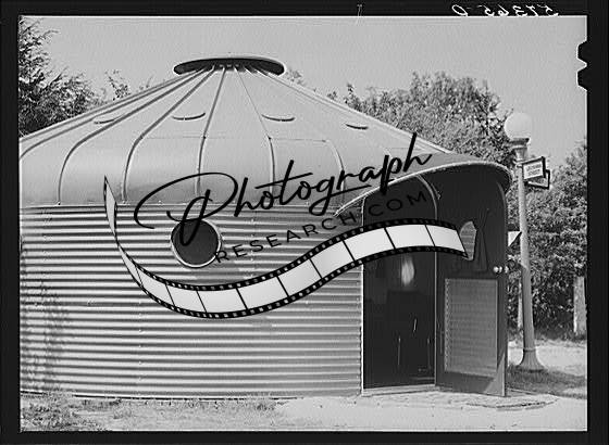 Title: Diamaxion house, metal, adapted corn bin, built by Butler Brothers, Kansas City. Designed and promoted by R. Buckminister Fuller