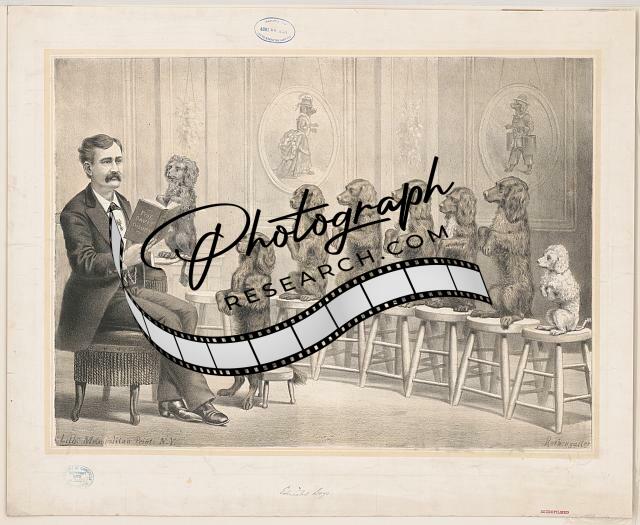 Educated Dogs,c1875,Man Reading to Dogs sitting on Stools,Animals