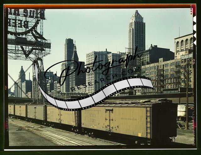 Title: Diesel switch engine moving freight cars at the South Water street freight terminal of the Illinois Central R.R., Chicago, Ill.