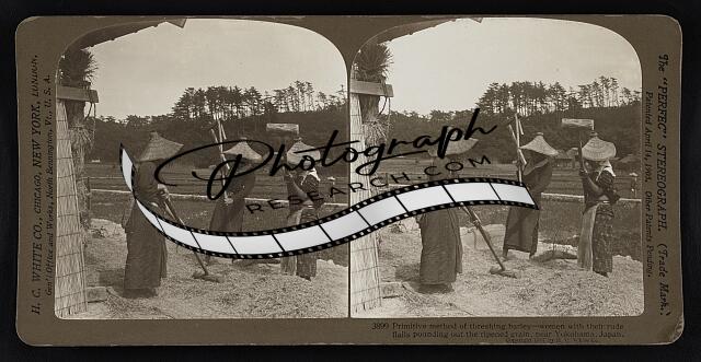 Primitive method of threshing barley--women with their rude flails pounding out the ripened grain, near Yokohama, Japan