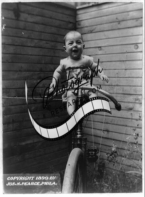 Baby,sports medals perched, bicycle held upright,rope,infants,children,c1899