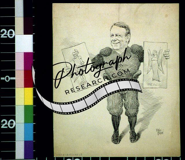 Daniels in football outfit holding up pictures of war,peace,c1916,World War I