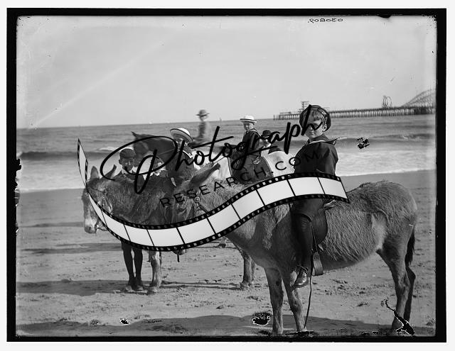 Children riding donkeys,beaches,animals,docks,piers,Detroit Publishing Co,1890