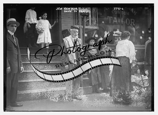 Jewish New Year - going to prayers,Tailor store front,people gathered,stroller