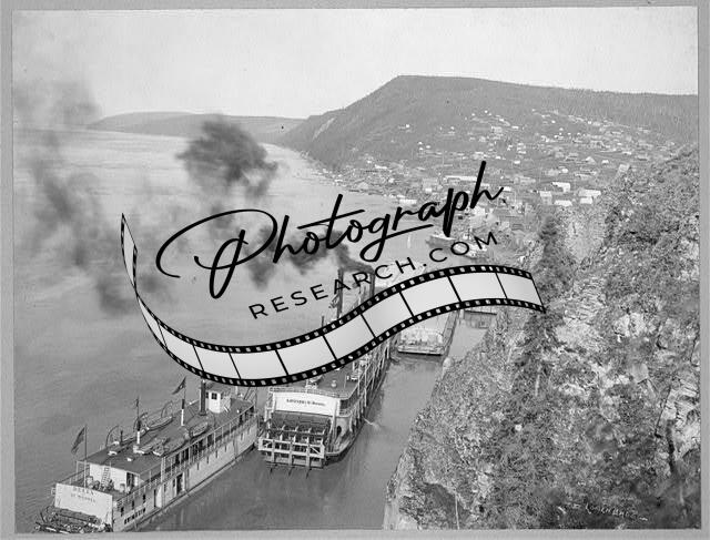 Riverboats distant view of town,Ruby,Alaska,AK,Waterfront,Yukon River,Steamboats