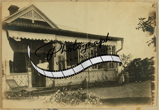 Dacha Seyuza, with the Pray family and servants posed on the front porch, near Vladivostok, Russia