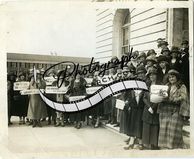 Group of women holding placards with political activist slogans: "know your courts - study your politicians," "Liberty in law," "Law makers must not be law breakers," "character in candidates," etc.