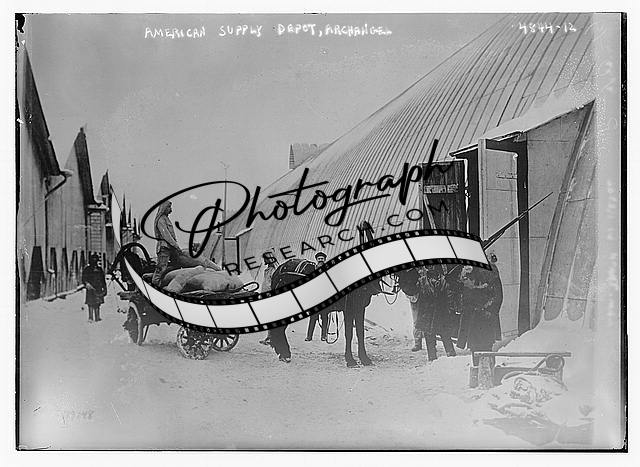 American supply depot,carts,wagons,transportation,horses,buildings,Archangel