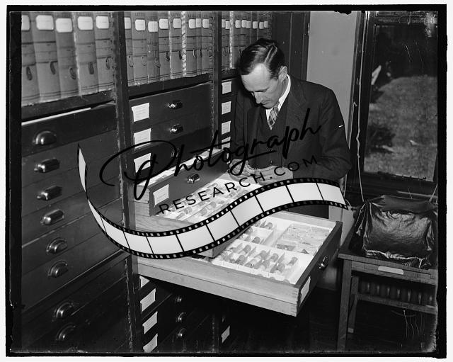 Title: Bones of earliest mammals being studied at Smithsonian Institution. Washington, D.C., May 8. One of the largest collections of the bones of some of the earliest mammals are now being studied and classified at the Smithsonian Institution. Dr. C. Lewis Gazin, Smithsonian paleontologist shown in the photograph, obtained specimens of [more] than 50 species of long-extinct creatures from the so-called 'Puerco and Torrejon Horizons' in New Mexico last summer. The Puerco and Torrejon formations date back approximately 50,000,000 years, to the time when present life forms began to make their appearance, 5/8/37