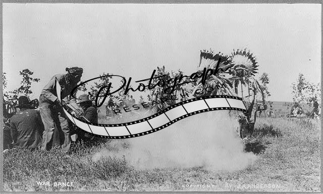 War dance,Indians,c1911,man shooting at ground,smoke,headdresses,smoking pipe