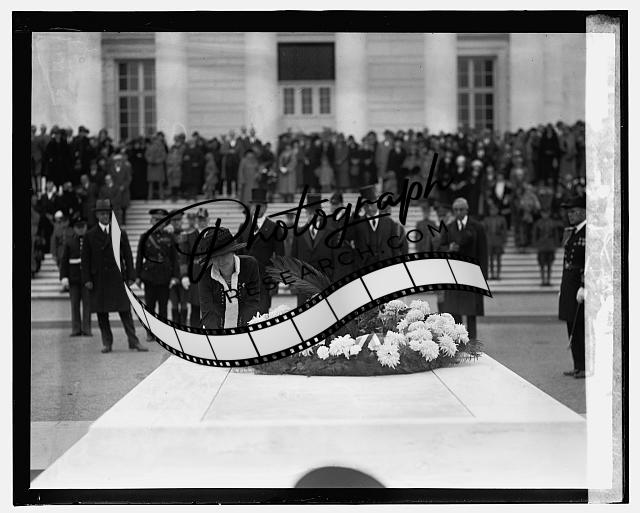 Mrs. Coolidge places white rose on Tomb of Unknown Soldier,Arlington,Virginia