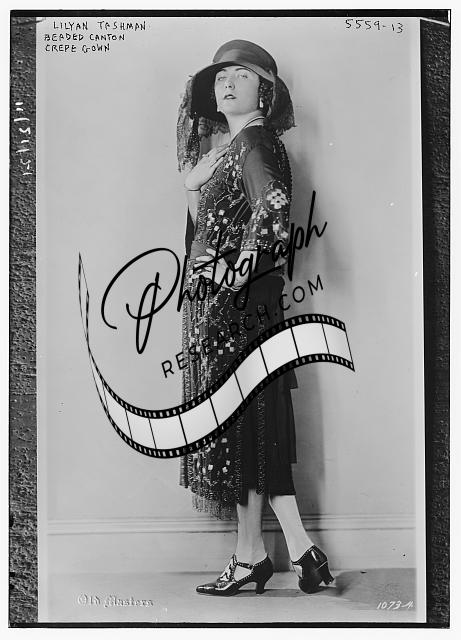 Lilyan Tashman,wearing beaded Canton crepe gown,dresses,hats,veils,women,sashes