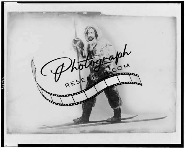 Frederick Albert Cook, full-length portrait, standing, dressed in furs and wearing skis, facing left