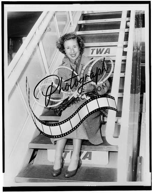 Maureen Connolly holding tennis rackets,boarding steps of airplane,1953