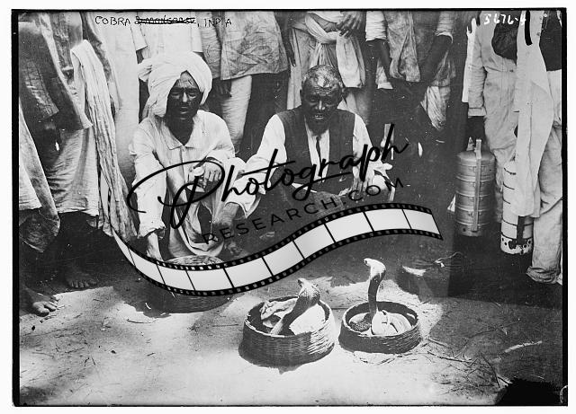 Cobra Charming,animals,snakes,baskets,crowds,men,turban,India,Bain News Service