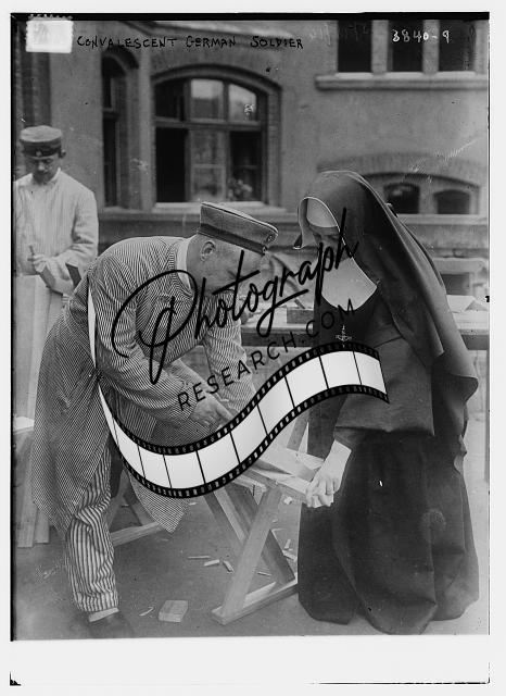 Convalescent German soldier,nun,man sawing piece of wood,tools,Bain News Service
