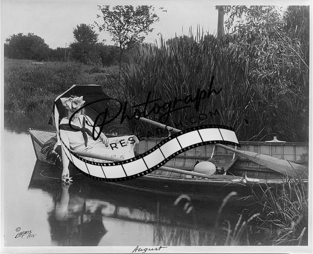 August,Girl in rowboat holding parasol,August 2,c1915,Boat,dangling arm in water