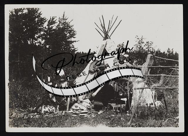 [[Chippewa family sitting in front of tipi as elderly man mends net]]
