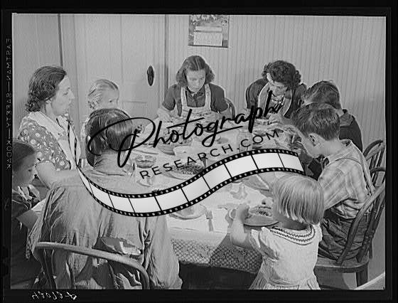 Title: Dinner hour at the home of Mr. J.H. Dube, French-Canadian potato farmer, after he and the boys had finished a day's work in their potato field in Wallagrass, Maine
