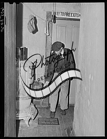 Title: Men sitting around stove in lobby of thirty-five cents a night hotel. Dubuque, Iowa